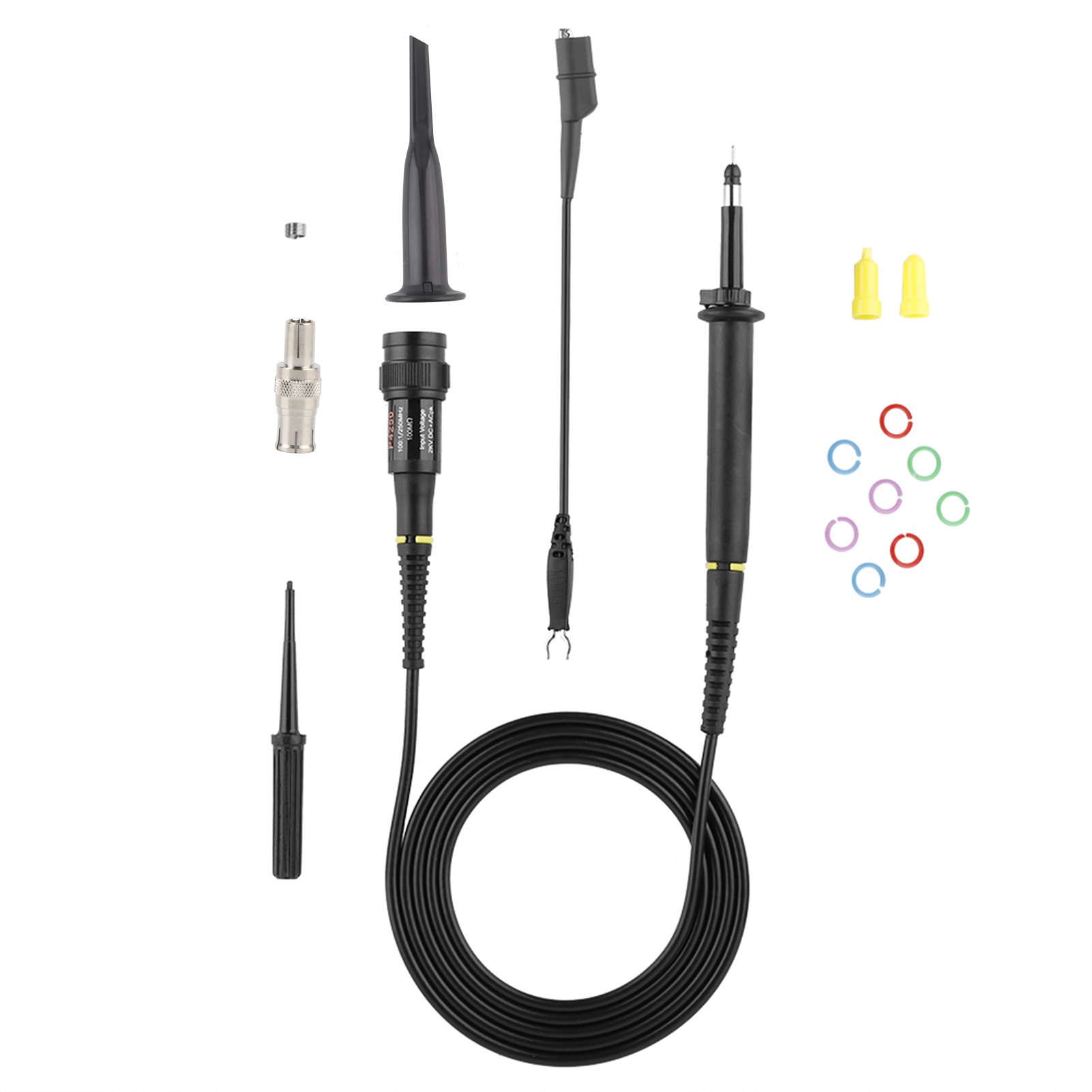 Features: Insulated BNC head, high accuracy, suitable for all standard BNC head oscilloscope. Compact size, several functions combined in one, this probe is convenient to use. Detachable hook tip, the hook is well protected by the plastic case. Locating sleeves ensure the stability and reliability of the tip exposed to the test point. Marker rings in different colors help to identify different channels. Great choice for oscilloscope probe. Specification: Model: P4250 Type: BNC Band Width: 250MHz Rise Time: 1.4ns Attenuation Ratio: 100:1 Resistance: 100MΩ ± 2% Input Capacitance: 100X: 5pF Save Environment: -20-60°C, 0~90%RH Operating Environment: 0-50°C, 0~80%RH Compensation Range: 10pF-35pF Operating Humidity: 0-80%RH Line length: approx. 120cm/47.2in Weight: Approx. 94g/3.3oz Package list: 1 x Probe 8 x Marker rings 1 x Ground Lead 2 x Locating sleeves 1 x Adjustment Tool 1 x Ground Spring 1 x Probe hook 1 x connector Note:Please note that the new type and old type of this product will be sent randomly, and make sure you will not mind before ordering.